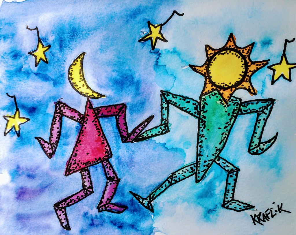 When the Moon Danced with the Sun, The dance began before they met. It started with the Sun chasing the Moon around the world. When the Sun could not take the hunt any longer, it finally called out to the Moon. They pause their chase to look at each other. “What is it?” asked the Moon. Only smiling, the Sun holds out his hand for the Moon to take. The stars in the sky all assemble to watch what is to happen. Below them, the ocean starts to rise and fall. As it does, the sea’s voice creates music with its roar and crash of its waves lashing the shore. With that, the Sun and Moon begin to dance. Shining in the sky, dancing the night away. When morning beckoned, the dance came to an end. Bowing to one and the other, the time had come, once again, for the Sun and Moon to go their separate ways. For each to take turns brightening the sky. http://www.angelwingartfarm.com