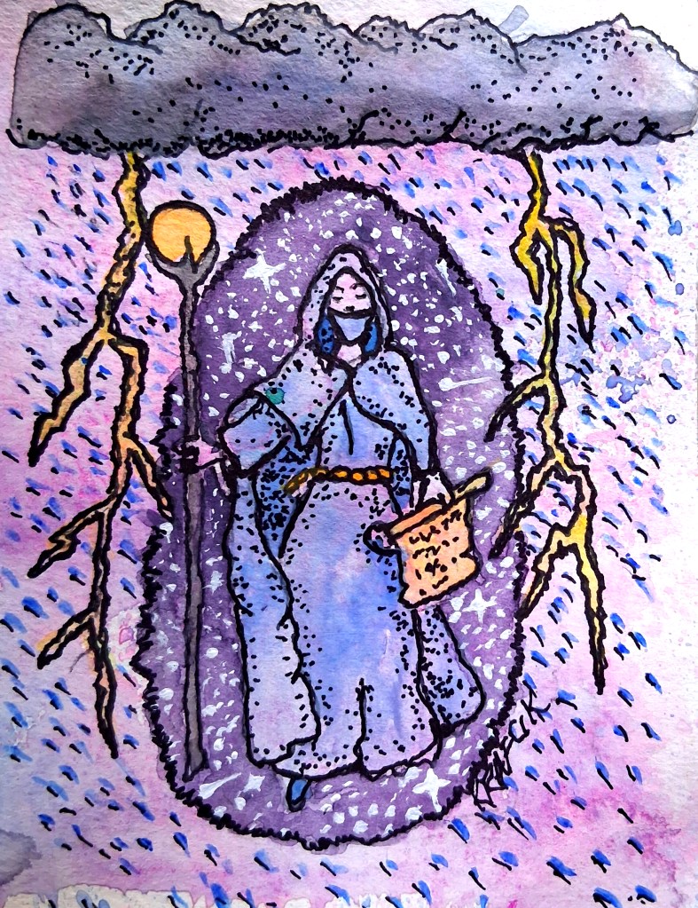 On that faithful morning, a raging rain storm accompanied by hail and sleet doused all of Aven, including the steps of the Council of the Moon, Sun, and Stars. Then, a ray of light suddenly poked through the dark, ominous black clouds. At that moment, one would have thought the storm might be ending, but suddenly a flash of blue lightning streaked down from the clouds above and struck upon the pavement, sending the ground debris far and wide. The air hummed with ancient magic, then, without warning, parted, and a portal from another land opened. A stranger appeared and walked out of the opening in the air. This newcomer wore a veil over her face and a sky-blue hooded cloak tied with a golden rope. Both hands were occupied. In one, a black staff, said to be made of a fallen meteor, and in the other, the reason she had come to this planet.