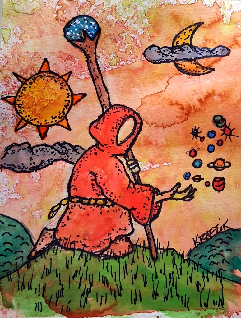 “Gardener of Galaxies” to support or buy items with the painting, please go to https://www.redbubble.com/shop/ap/177379883?ref=studio-promote Gardener of Galaxies. This is a tale that was once whispered to me, and I feel it is my turn to whisper it to you. This is a story of one rare and uncommon Wisdom Seeker. A rogue that not only travels to other planets, gathering new Wisdom and Knowledge, but then turns around and spreads the findings to help restore worlds that had been stripped of their own intellectual knowledge and spiritual wisdom through greed and stupidity, leaving only an empty orb floating aimlessly through the galaxy. Because of his deeds, he is celebrated throughout the cosmos as a gardener of galaxies. Once long ago, the gardener of galaxies came to a particular planet that seemed to be as empty as a bowl. He was surprised to find that something about this world had a whole different vibe. A strong sense of healing emanated from it. He had never felt or come across it before. It was emanating a special power that seemed to come from its core. that, when tapped correctly, could give stripped planets a way to infuse them with life again. Here was a world that he could take and release the barren globes that he had taken under his care and carefully nursed back to life. Here, he infused the lessons he had learned throughout his cosmic travels to other worlds and planets. Climbing to the highest peak in this world, he bent to his knees, reached into his red cloak, and carefully grabbed a handful of worlds he had stored. Slowly, he opened his hand and like magic, which it was, the tiny worlds started to drift upwards. Then, when they reached a certain height, a cosmic wind touched them. When it did, the tiny worlds flew off to other galaxies to form brand new worlds. This is the story of the Gardener of Galaxies.