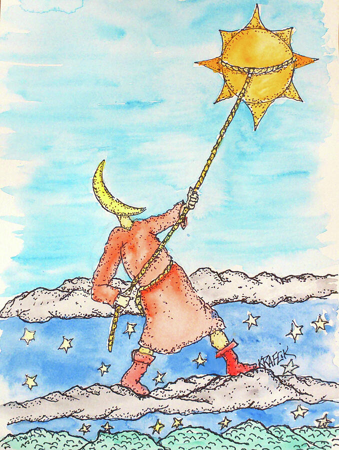 *Star Catcher: There was a time when the Sun held the same position in the sky each and every day. There was no Spring, Autumn, or Winter. Only Summer. The people of the Earth became weary of the same old, same old thing. The wise ones knew of an ancient group of space travelers that may be able to help in their quest to have different seasons. A summons went out for help. The answer to their call was heard. Coming to their aid was an ancient order of cosmic beings. They are referred to as the Star Catchers. Some of you may know of this order of cosmic existence, and others may not. If not, here is the story of the Star Catcher. It is a job that requires a specific type of person to do. Not many can aspire to be trained as a “Star Catcher.” Only a few can finally, after much training, achieve the status of a “Star Catcher.” To be a Star Catcher, one must possess a steady hand and an excellent aim. Once approved and certified, they are awarded a golden magical rope that is used to lasso stars from the sky. On the day the Star Catcher arrived, he positioned himself on the highest cloud he could find. Taking a firm footing, he looped the golden magical rope around the Sun, tightened it snugly, and slowly brought it back to Earth. Once secured, it was then placed in a cosmic box and sent on its way to the Garage of Stars for a thorough inspection. There, it was quickly worked on. The objective of the work is to cause the Sun to move from its location, which it has held steadily for years, in the Earth’s sky. They removed the brakes and installed a spring. Then, without the brakes, a mechanism is installed to allow the Sun to move freely across the sky. When it moved slowly to the North and finally reached the lowest level in the sky, the springs they placed in the Sun would help bounce it back slowly to the level that it had started from, and when it reached that spot, it would slowly start its downward motion once again. This movement would occur repeatedly, and with that help, Earth’s people finally experienced four distinct seasons. All the land was ever grateful for the assistance of the Star Catcher. http://www.angelwingartfarm.com
