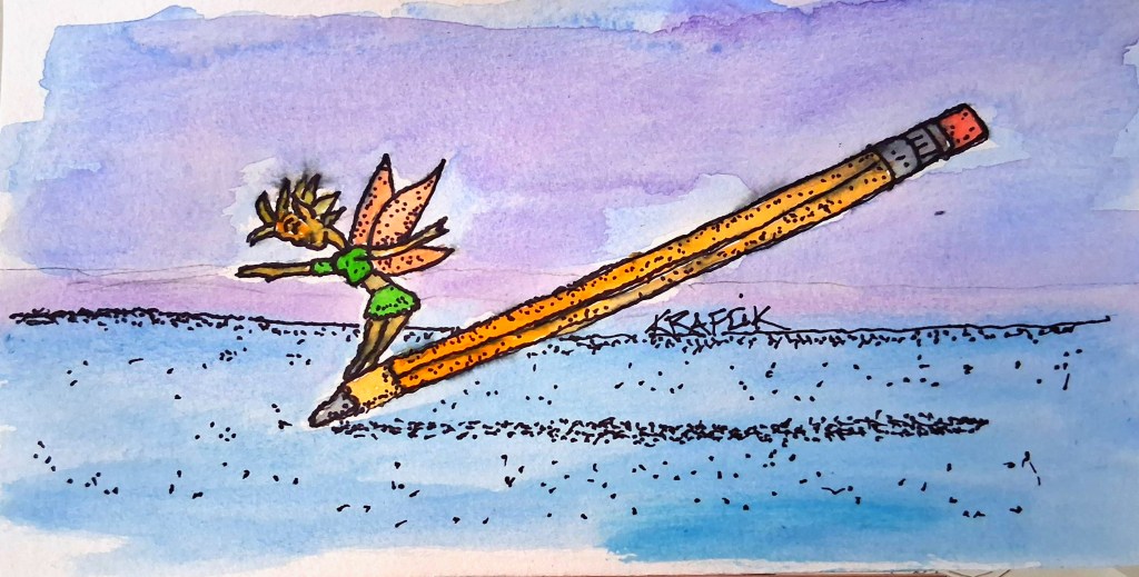 I finally rescued some of my long-lost pencils from the storage unit. Really, an artist without pencils (Shame on me). Happy to be back at the ranch, I took out my newly found pencils and gave them a sniff (weird, maybe, but I love the smell of a new pencil). Now, the first thing with a new pencil is to get my knife out and start to whittle away the wood to expose the graphite. When I exposed the hidden graphite, there was more hidden within the pencil than just the graphite. To my great surprise, this particular lead-marking tool contained a wood sprite. Yep, you read that right, a WOOD SPRITE!!! As this story continues, it seems that this here wood sprite had somehow become trapped inside the wood of the pencil I so happened to be whittling. How do I know this, you may ask? Ah, patience, dear readers, patience. Now, shocked as I was (wouldn’t you be?) I dropped the newly whittled pencil. As I sat there, the only thing I could think of was to ask, “Who in the world would you be?” Slowly, the wood sprite stood up and walked on over to the exposed graphite and, in a high-pitched voice, replied to my question, “Why, I be a wood sprite, my dear sir.” Then, with a deep bow, the newly found wood sprite continued,” And, you, my fine sir, have released me from that prison some call a PENCIL. I be trapped inside for all too long to tell.” “Now, how in the world did you get trapped in a pencil?” I asked in wonderment of my newfound wood sprite. ‘Well, my fine sir, it seems that the magic woods I inhabited were invaded by some mighty mean tree, cutting down folks. It so happens that the tree I have called home for many a moon was picked for these roughens to chop down. After a while, me and my tree home were brought to some faraway land where us both were made into a pencil!” “That is quite a story,” I said as I shook my head in disbelief. The wood sprite nodded its head and then replied, “It all be true, my kind sir.” Then a strange noise came from the wood sprite, and the little fellow spat on the pencil it had just been released from. Shaking its head, it then looked up at me and in a commanding, but still very tiny, voice,” Well, my dear sir, as within my oath as a tree sprite, and for rescuing me from this pencil prison, I do be obligated in granting you a favor, as it be, my dear sir.” “Oh, my dear little wood sprite, I ask for no favors from you. It was my pleasure to help you escape the pencil.” I answered. “Well, my dear sir, that is not the way it works in my world. One good favor deserves another.” I sat thinking for a moment, and then the wood sprite, in a questioning way, replied, “Well, my dear sir, what were you to be doing with the pencil?” “I have been having trouble getting into the creative mood, and I hoped that putting pencil to paper might help.” The wood Sprite scratched its head, looked up at me, and, with a laugh, said,” Well. , my dear sir, I can help with that.” Then, reaching deep within its pocket, pulled out what appeared to me to be rainbow-colored dust. The Wood Sprite raised it to his mouth and blew the rainbow colored dust on me. “Well, dear sir, there you go. I’ll be a moving on now.” And with a flash, the Wood Sprite vanished from my sight. I shook my head, and when I finally stopped coughing from the rainbow colored dust. I laid the pencil on the paper, and to my amazement, I started to draw. Boy oh boy, did I ever draw. Now, thanks to sharpening a pencil and releasing a Wood Sprite, the cap on my creativity has come off, and I am back to being “The Space Ship called David.” Now, that there be a true story, my dear sir.