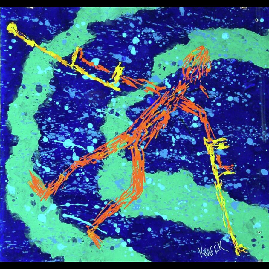 The painting “No Stairway to Heaven” by artist Krafcik, executed in Reverse Glass Painting, immediately draws the viewer in with its bold use of color and dynamic composition. The use of bright, contrasting, strong colors tells a tale of a hard but determined journey. At first, you see a man with crutches and a staircase. As you look again, the man and the staircase become one. In this dreamlike scene, the staircase shows not only his journey but also his strong will. A determination of his climb, a climb that is both physical and emotional. The bright, wild colors show his struggles, but the path is marked by a glowing blue, a sign of hope and strength. Where the orange signifies the chaotic, difficult reality he now faces. The colors visibly express the constant effort to maintain one’s own shape, identity, and path amid overwhelming intensity and odds. A work of art that is not just about a man climbing, but about a spirit rising beyond its limits.