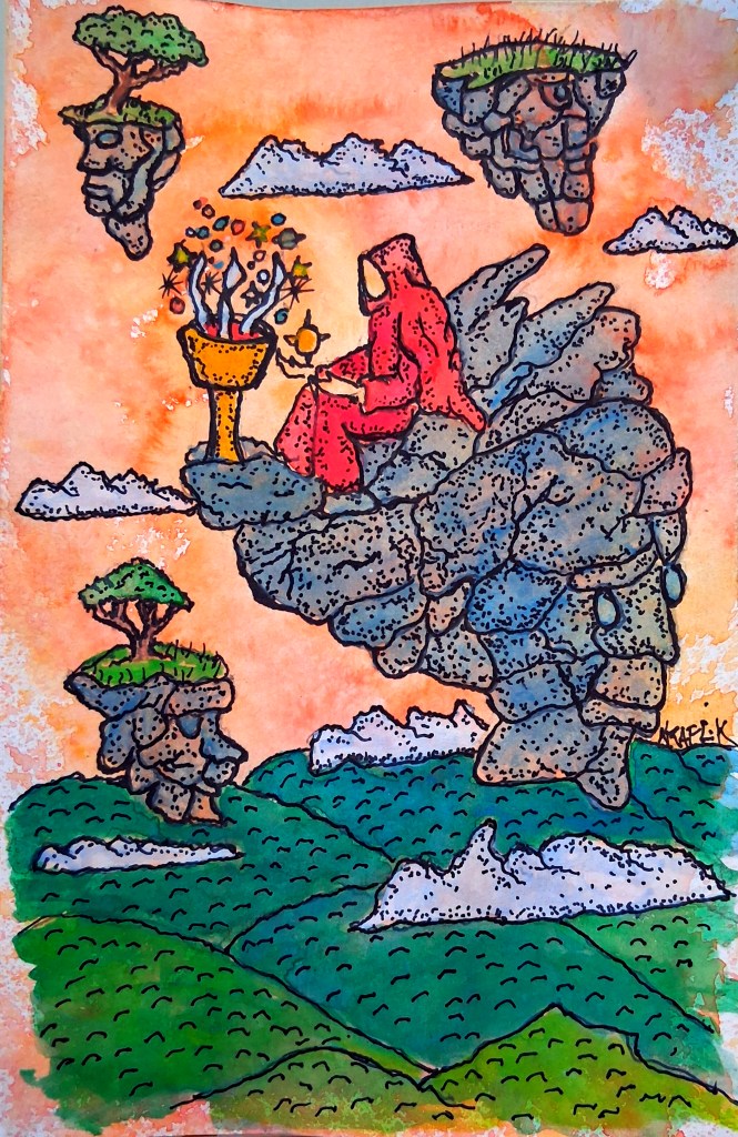 Wisdom Seeker: They did not know where he came from, but one day a stranger appeared out of thin air, attired in a red-hooded cloak tied at the waist with a golden rope. When asked about himself, he referred to himself as a Wisdom Seeker sent from the planet Aven. The guest explained that he was in their little village to climb the local mountain. When the townsfolk asked him why, the Wisdom Seeker replied that he did not at this time know why, only that he felt that it was important to reach the peak, as that was where the answer might lie. As the whole town gathered to see the Wisdom Seeker off early the next morning to wish him well on his adventure, the wind began to blow, and with it, there fell a heavy snow. The folk, fearing for his safety, begged him to stay until another day. The newcomer replied that the task needed to be achieved that day and only that day. So off he went. The climb was hard going with the whipping wind and snow, but he persevered. At one point of the ascent, a thick fog formed. But unknown to the Wisdom Seeker at the time, it was clouds he was traveling through. Finally, the wanderer marched above them to reveal a clear, half-day-night sky. A quarter Moon shone above him, accompanied by three stars. Out to the valley hung the Sun with three clouds basking in its warmth. Reaching the summit of the mountain and unable to climb higher, the Wisdom Seeker spread his hands to the cosmos and yelled, ” I am here seeking your wisdom.” It is said throughout the universe and beyond that, the knowledge he sought and then gained was so overpowering and the ultimate truth that it held so profound that it spread his consciousness between the warmth of the Sun, the light of the Moon, and the song of the stars. In the end, it left not a physical trace of the Wisdom Seeker who had climbed the mountain to seek the knowledge he had sought to obtain. Now, on this same date each and every year, a new stranger appears in the same little village, looking to climb the same mountain. He, too, will never be seen again.